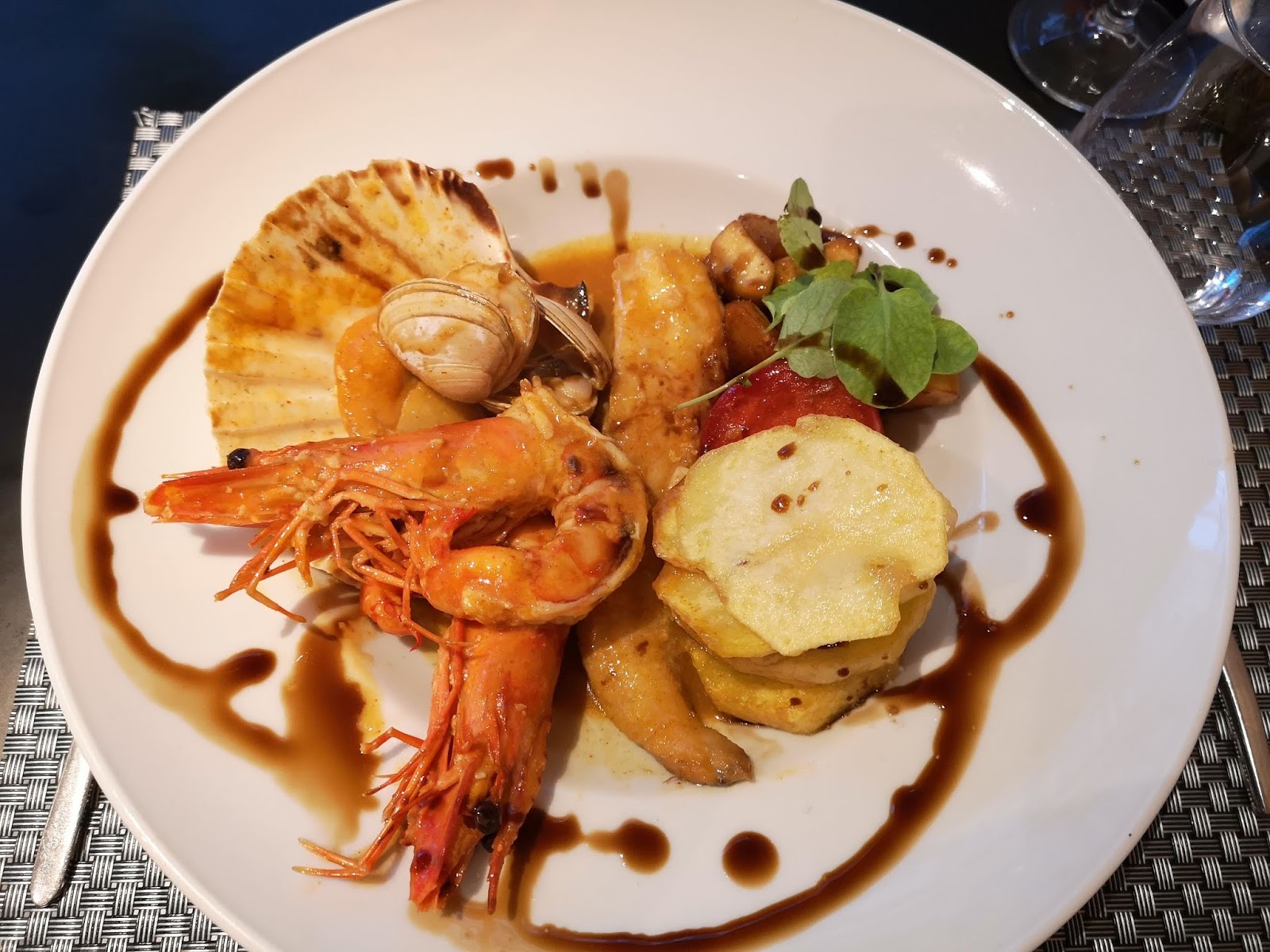 Y Medallones de Rape con Gelatina de Hierbabuena y Gambas. Lo mejor de toda la comida. Espectacular. Almejas, una vieira enorme, calabacín, langostinos pelaos, y toque de vinagre de Oporto, que con la salsa del pixín queda genial. A todas, el pixín perfecto. La salsa lleva además un toque cítrico, y en sabor un toque a sopa de pescao. Plato brutal.