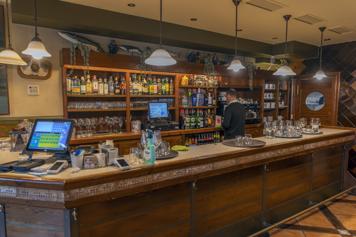 Entrada preciosa en maderas, clásica. Con una barra y detalles marineros. A la derecha, salón enorme. Y en el piso de arriba, otro salón, con vistas preciosas.