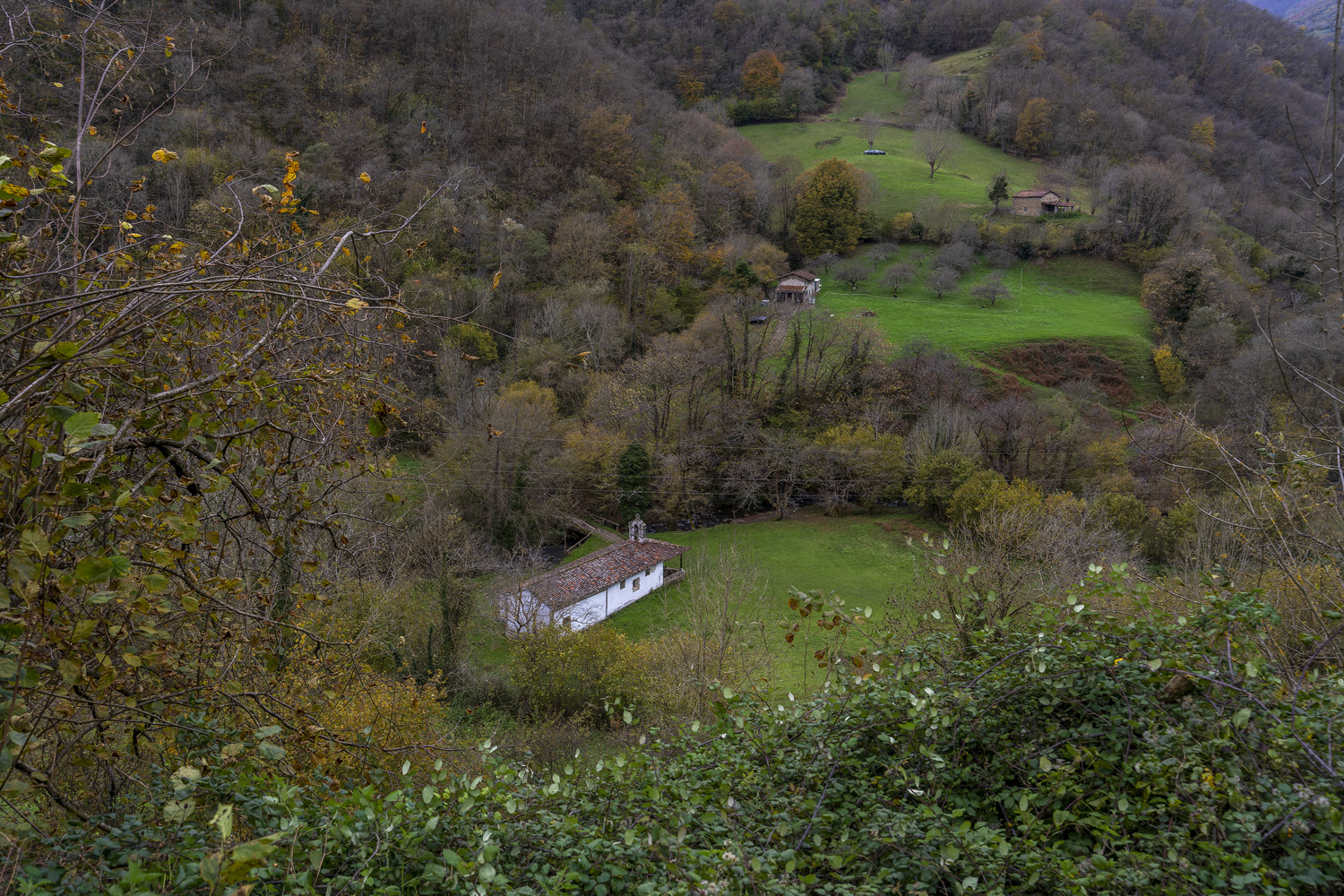 En seguida llegamos hasta la Ermita de la Flor. Preciosa ermita del SXV, con un práu donde se hace una romeria el lunes siguiente al lunes de Pascua, desde la Pola, con música, sidra y comida.